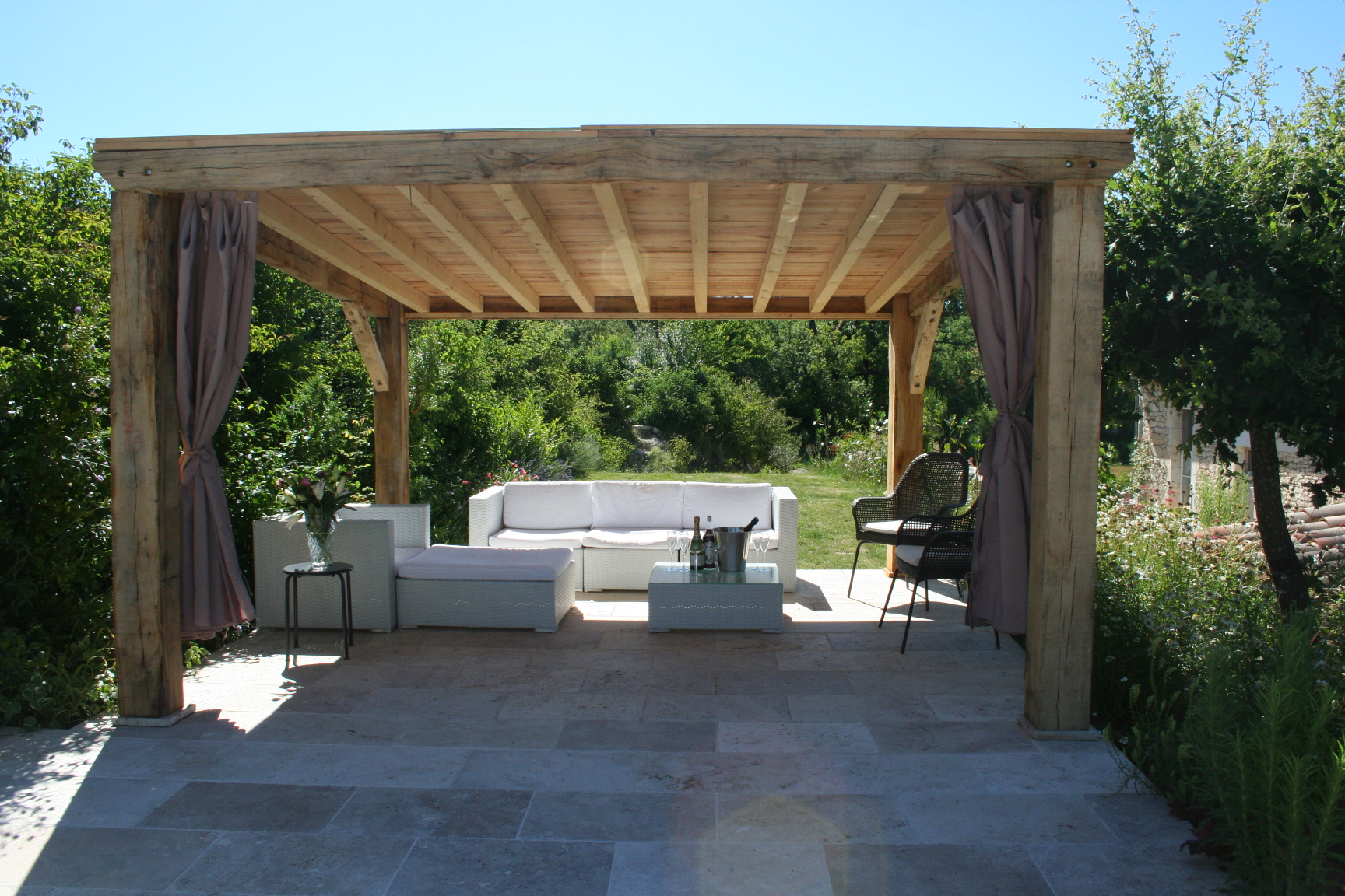 Covered seating area by pool