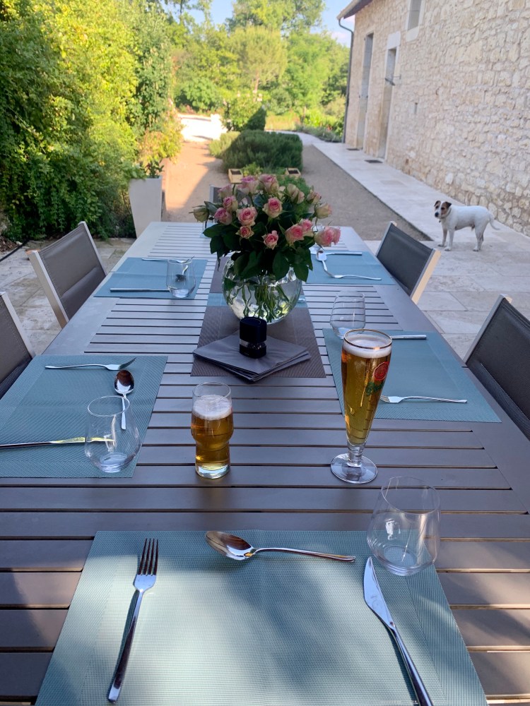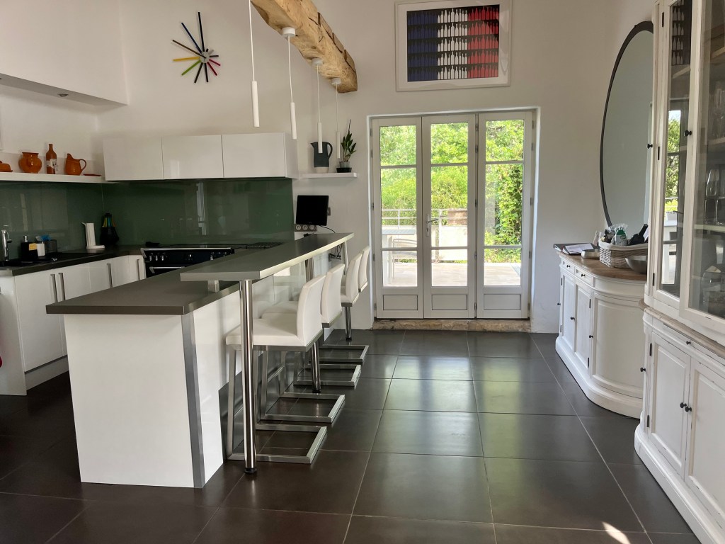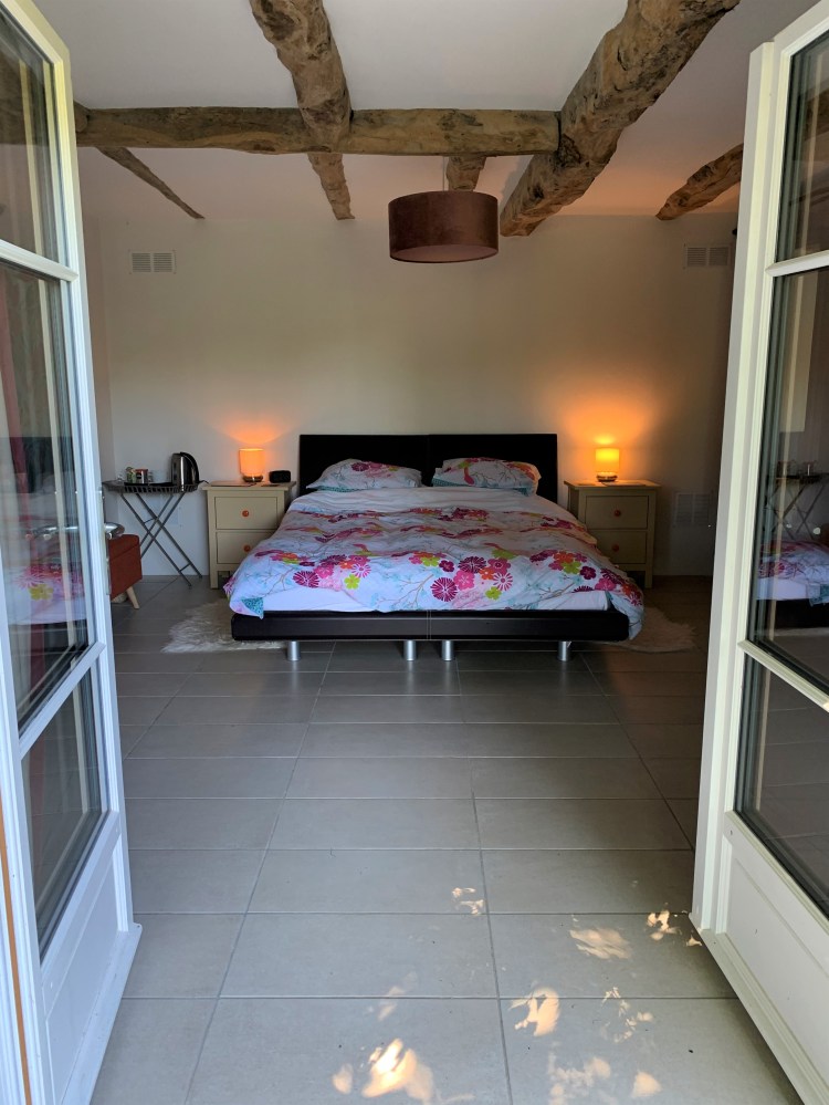 Large, modern, open plan and light with a double height ceiling and exposed oak beams. It has 2 sets of French doors that open out to garden terraces – 1 sunny with views of the local countryside, the other covered and shady with outside kitchen. Both terraces have a large table with plenty of chairs so you can eat al fresco